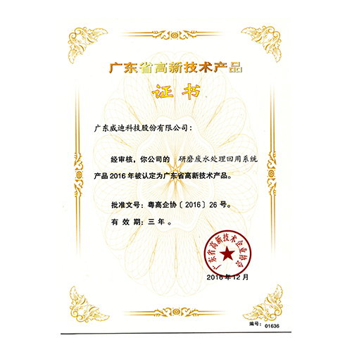 2016年廣東省高新技術產品-研磨廢水處理回用系統