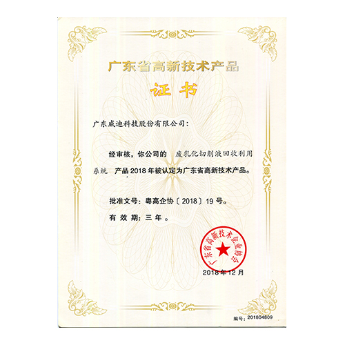 2018年廣東省高新技術產品-廢乳化切削液回收利用系統