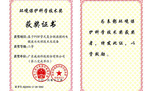 廣東威迪科技股份有限公司(股票代碼:870419)作為主要參與單位完成的科研項目“基于PVDF管式復合微濾膜的電鍍廢水處理技術及設備”項目獲得了2016年度中華人民共和國環境保護部以及國家環境保護科學技術獎獎勵委員會聯合頒發的的環境保護科技獎二等獎。