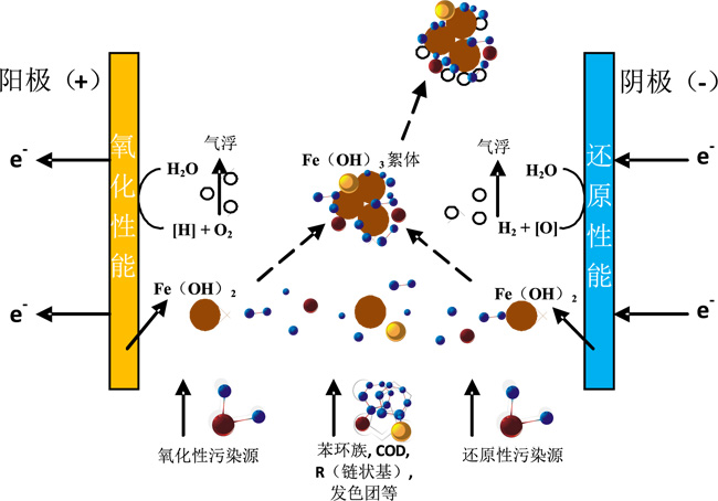 金屬極板受電化學(xué)作用,以離子狀態(tài)溶于水中,電解過程中H+大量消耗,OH-逐漸增多,電解液逐漸變?yōu)閴A性,(PH:7-9)并生成穩(wěn)定氫氧化物沉淀。
