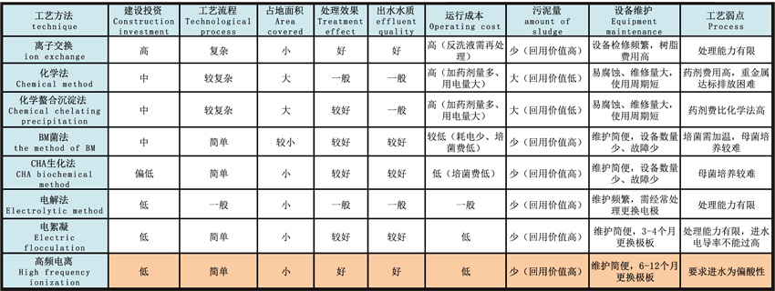 連續(xù)高頻脈沖電離膜處理法產(chǎn)生的氫氧化物比藥劑法的活性高,凝聚吸附能力強(qiáng), 處理效果好,可達(dá)到回用水質(zhì)標(biāo)準(zhǔn)(化學(xué)處理法難以達(dá)到)。