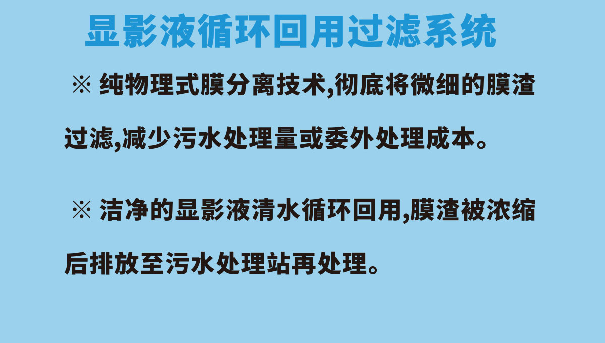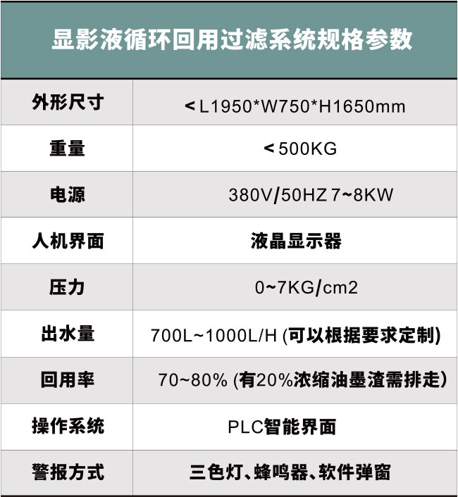 顯影液循環(huán)回用過濾系統(tǒng),打破了傳統(tǒng)的PCB板顯影液的管理方式,不用每天排放,可以循環(huán)使用,提高了生產(chǎn)效率,保證了顯影點(diǎn)的穩(wěn)定性,提升了PCB板的生產(chǎn)品質(zhì)、可大幅減少廢水廢渣排放,有效利用了水資源,節(jié)能環(huán)保。