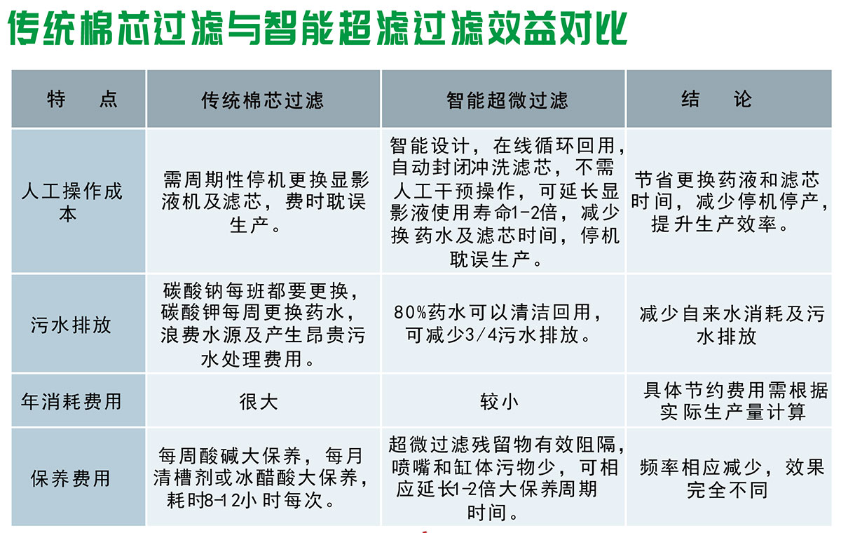 而傳統(tǒng)棉芯過濾系統(tǒng),已經(jīng)延用快30年。隨著線路板的高精密飛速發(fā)展,及越來越嚴(yán)的環(huán)保法規(guī),已經(jīng)很難滿足市場發(fā)展需求。使用壽命一般1~2天必須更換,費(fèi)時費(fèi)力,換下的費(fèi)棉芯屬危廢固體,也越來越高的處理成本。