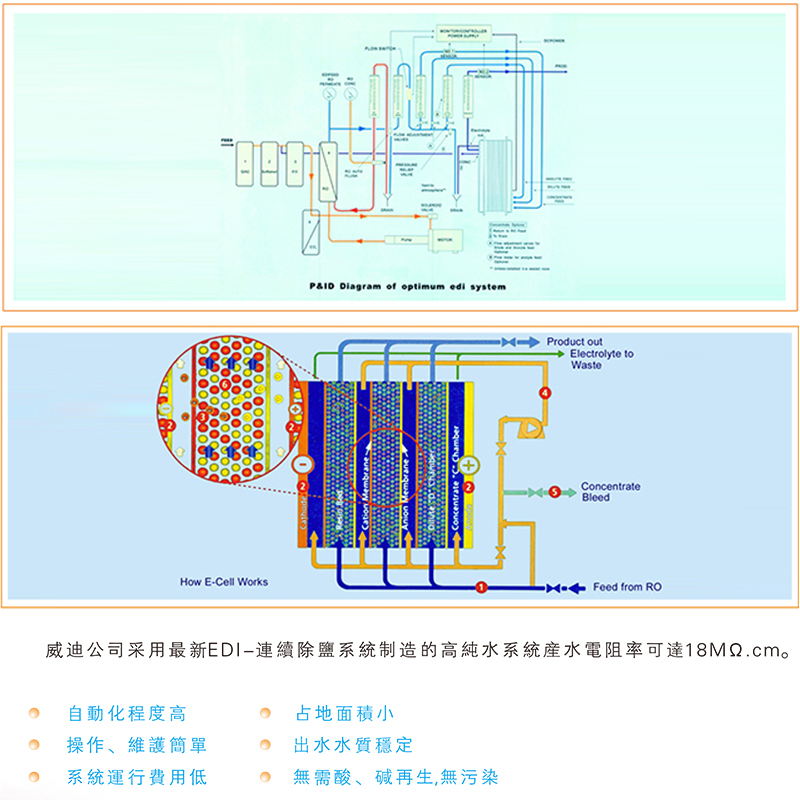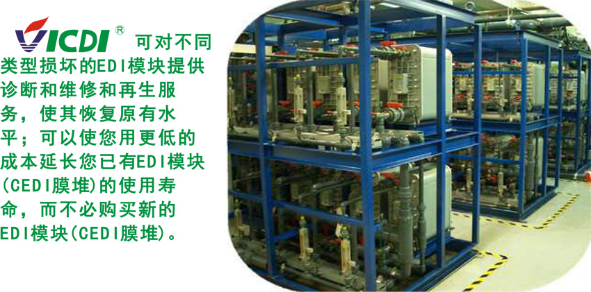 威迪是一家專業(yè)提供超純水技術(shù)服務(wù)的高新科技企業(yè)。公司匯集了一批專業(yè)從事超純水處理技術(shù)研究、工程安裝,售后服務(wù)經(jīng)驗(yàn)豐富的工程技術(shù)人才,可為廣大客戶和工程公司提供提EDI問題的診斷和維修服務(wù)。本公司具有多年的EDI使用和售后服務(wù)經(jīng)驗(yàn)。本公司擁有專用的EDI清洗再生設(shè)備、樹脂、陰陽膜片、陰陽極板等配件,對(duì)任何原因造成的EDI接頭斷裂、內(nèi)部發(fā)熱燒壞、純水室污堵、濃水室積垢、背部漏水等造成的EDI水質(zhì)下降問題,本公司都可以修復(fù)如新。