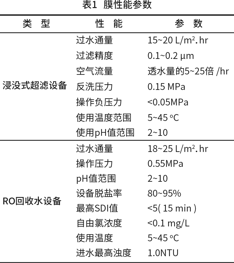 某印染公司的印染廢水中水回用工程由2個(gè)系統(tǒng)組成:一是新建了20000 m3/d的物化、生化處理系統(tǒng),使印染廢水COD濃度降到100~200 mg/L;二是配套建成了8000m3/d廢水深度處理的膜處理系統(tǒng),利用“雙膜法”技術(shù)再對(duì)印染廢水進(jìn)行深度處理之后,全部回用于生產(chǎn)中,本工程采用的膜性能參數(shù)詳見表1。該工程處理污水量20000 m3/d,其中回用8000 m3/d,占地面積20000m2,建筑面積3000m2。